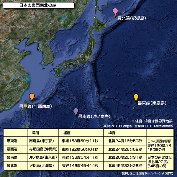 ¶豆知識 − 日本人が住んでいる国土の東西南北の端