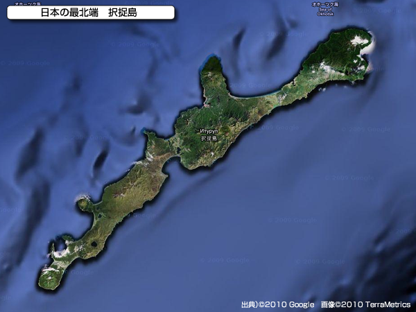 択捉島は、北海道の北東の端からオホーツク海と太平洋を分けてのびる列島にある島の1つです。面積は約3183平方km、島の長さ約204km、幅は約6〜30kmの細長い形をしています。この島にある「カムイワッカ岬」が日本最北端で、北緯45度です。