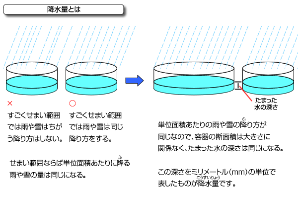 降水量とは、地表に降った雨や雪などの水の量をはかったものです。雨量計という機械ではかりますが、雪やあられなどは、水に溶かしてはかります。10分間の降水量、1時間の降水量、1日の降水量というように、時間あたりにして表現します。例えば1時間に1ミリの降水量とは、雨量計の容器に1時間に深さ1ミリの水がたまるくらいの雨や雪が降ったということです。