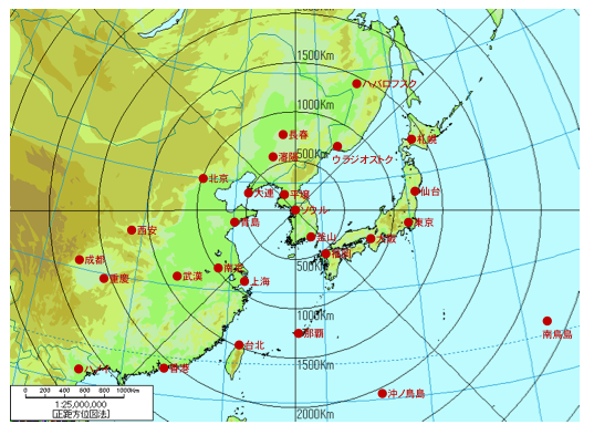 半径500km以内に朝鮮半島を全ておさめ、福岡も約550kmの位置です。半径1000km以内に中国の首都北京、南京、上海、日本では大阪、ロシアの港町ウラジオストクなどの重要な都市が入ります。半径2000kmまで伸ばすと、日本がすべて円内に入ります。中国内陸の歴史都市西安、工業都市重慶、ロシア沿海州地方の中心都市ハバロフスクもふくめて、東アジアの重要都市をおさめてしまいます。